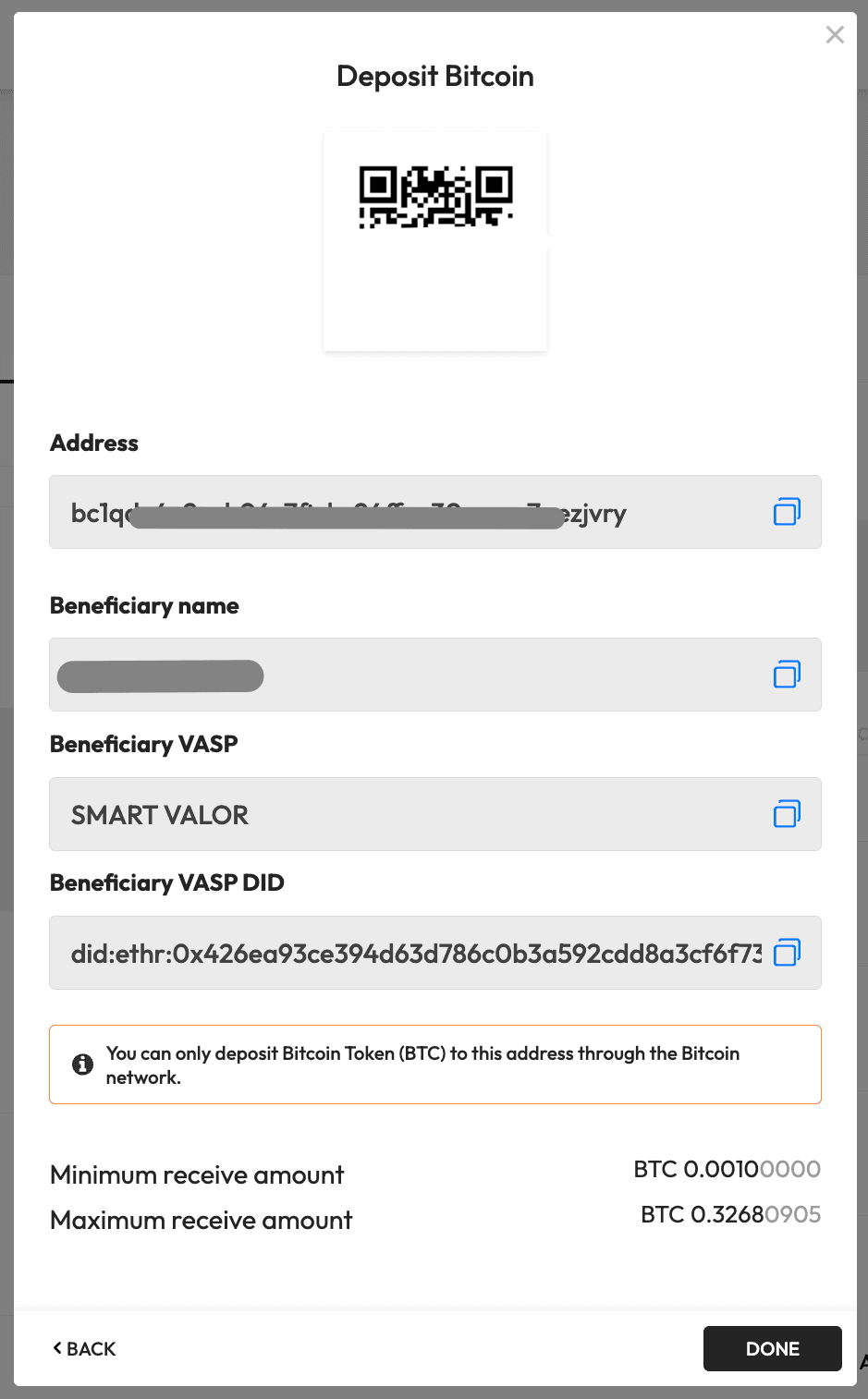 Once you have made the deposit, you can click the “Done“ button to close the screen. The deposit will reach your account as soon as it is processed on the blockchain.